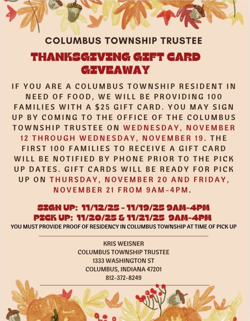 f you are a Columbus Township resident in need of food, we will be providing 100 families with a $25 gift card.