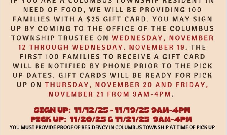 Thanksgiving Gift Card Giveaway — Columbus Township Trustee If you are a Columbus Township resident in need of food, we will be providing 100 families with a $25... Read More