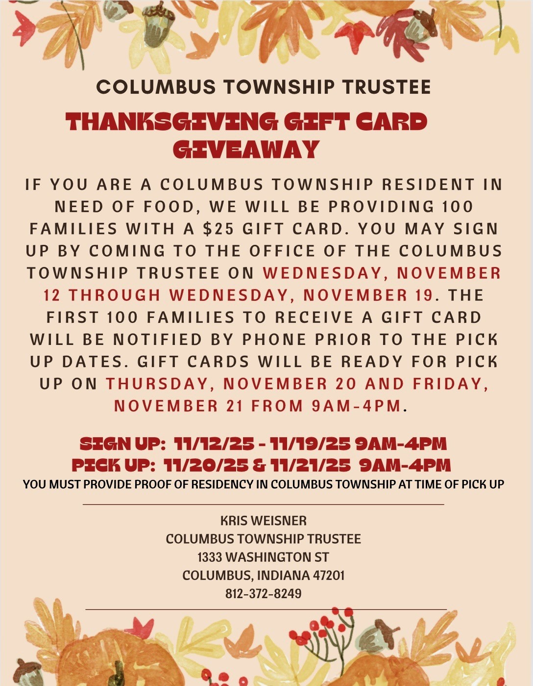If you are a Columbus Township resident in need of food, we will be providing 100 families with a $25 gift card. You may sign up by going to the office of the Columbus Township Trustee, located at 1333 Washington St. Columbus, IN on Wednesday, November 12 through Wednesday, November 19.